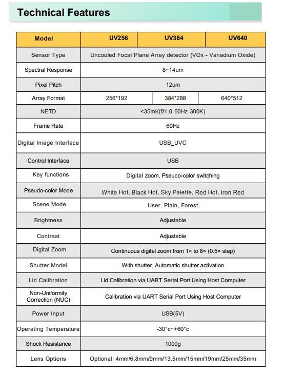 This industrial thermal camera module USB UC-541 solution delivers professional-grade LWIR 8–14 µm imaging in a compact 21×21 mm, ~18 g package. Featuring a USB-C interface and plug-and-play UVC Y16 stream, it integrates seamlessly into UAV thermal payload USB systems, AMR robots, and energy inspection cabinets.