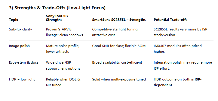 1. Question: For a starlight robotics project, which sensor is better in real-world low light: the IMX307 or the SC285SL?