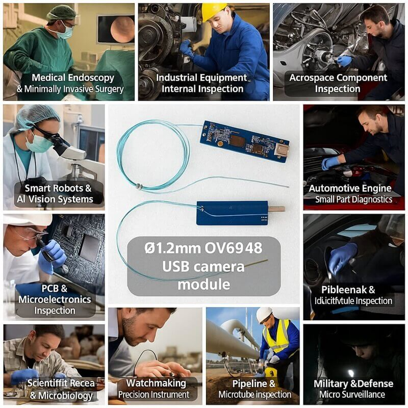 Its tiny form factor and high integration make it ideal for medical catheter imaging, borescope inspection, semiconductor defect detection, and microscope-level precision tasks. Whether used as an OV6948 catheter camera with LED for medical OEM tools, or as an ultra thin borescope camera for industrial inspection, this solution enables high-resolution visibility where other cameras cannot fit.