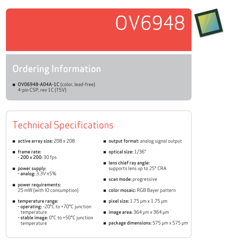 Sensor Size World’s smallest 0.575mm sensor (OV6948)