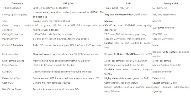 USB and AHD are both “right answers,” but for different system constraints. If your priority is software-defined control, AI integration, and minimal box count, USB (UC-501) is the pragmatic default. If you need long distances, immunity to EMI, and predictable latency, AHD (AC-501, IMX323) is hard to beat. CVBS remains niche for ultra-low-cost SD signaling.