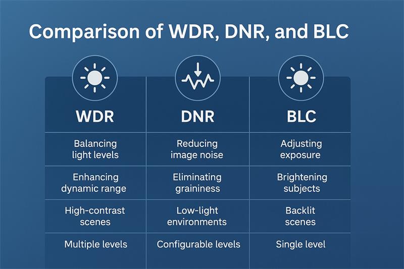 In industrial or retail environments, the ideal sequence is WDR → BLC → DNR, ensuring accurate exposure before noise suppression.