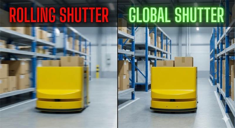 Most commercial cameras use Rolling Shutter sensors, which scan images line-by-line. When a robot moves quickly—like a Keenon delivery bot or a Unitree quadruped—this scanning delay causes "Jello Effect" distortion.