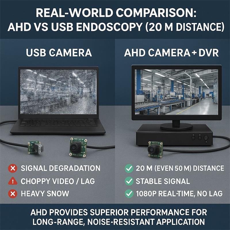 Reliability (AHD > USB): A USB signal severely degrades and lags after 5 meters. AHD maintains 1080P zero-latency up to 100 meters and is extremely resistant to interference in an industrial environment.