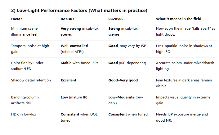 IMX307 defines the safest, most polished 2MP STARVIS baseline for low-light; SC285SL offers a cost-efficient starlight alternative that can approach similar results with careful ISP tuning and lens selection.